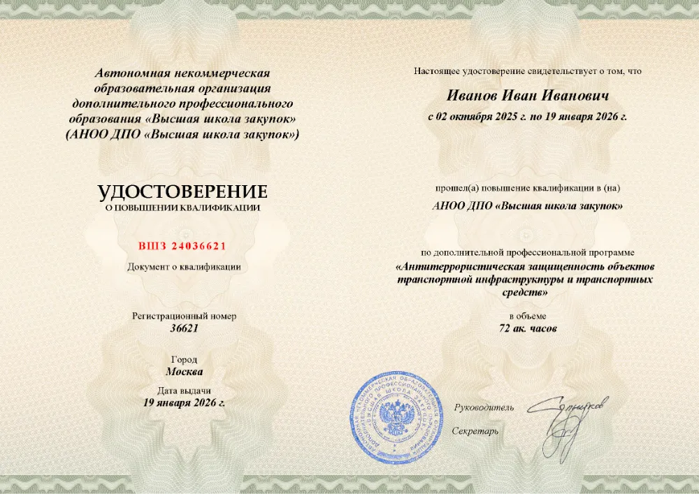 Повышение квалификации, 72 академических часов, 7 модулей: нормативно-правовые основы противодействия терроризму, анализ угроз и рисков, функциональные обязанности ответственных, инженерно-техническая укрепленность, документооборот и действия персонала при ЧС. Онлайн-обучение в в Оренбурге с итоговой аттестацией.